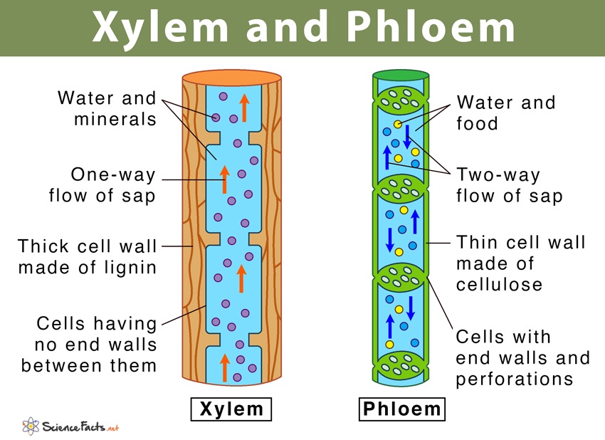 A plant transports water and minerals salts in specialised xylem cells. These cells form chains and then die, to form vessels. The xylem vessels run from the roots up to the leaves. They have thick cell walls, containing lingin, which makes the walls strong and stops them from collap