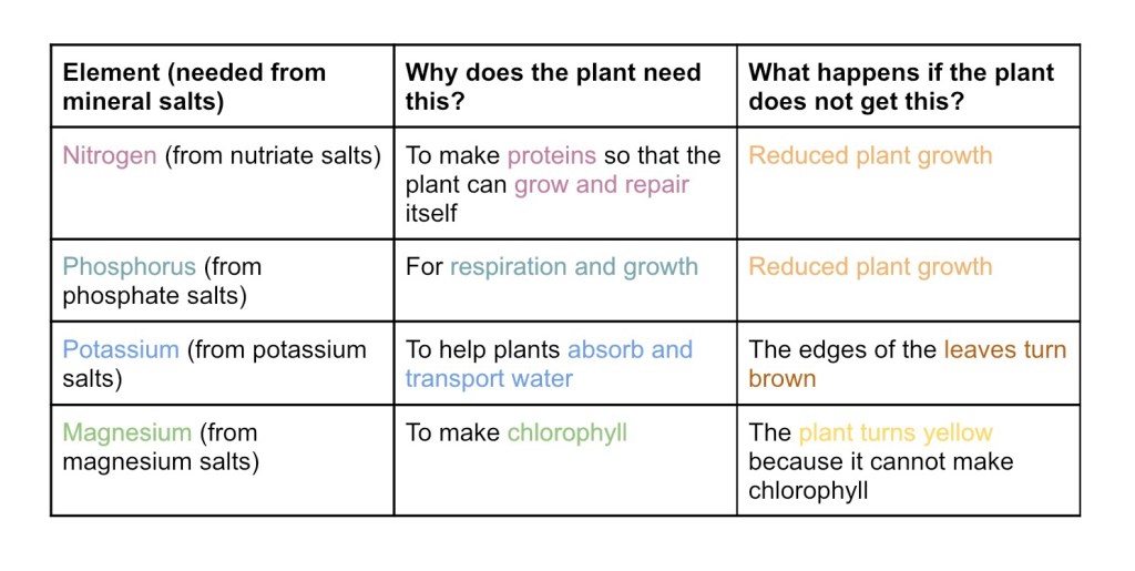 Water and mineral salts move from root hair cells to other root cells and into xylem vessels. They travel up the stem into the leaves and then the water vapour exits the plant through the stomata.