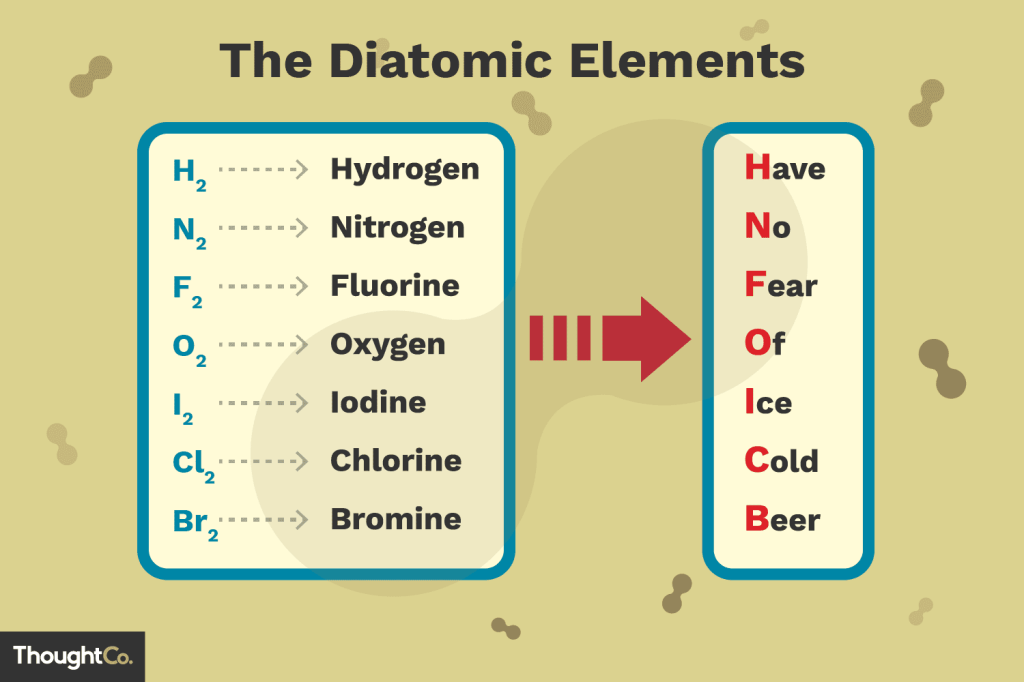 Diatomic Elements are atoms that are never found on their own. They form a bond with another atom of their same type.